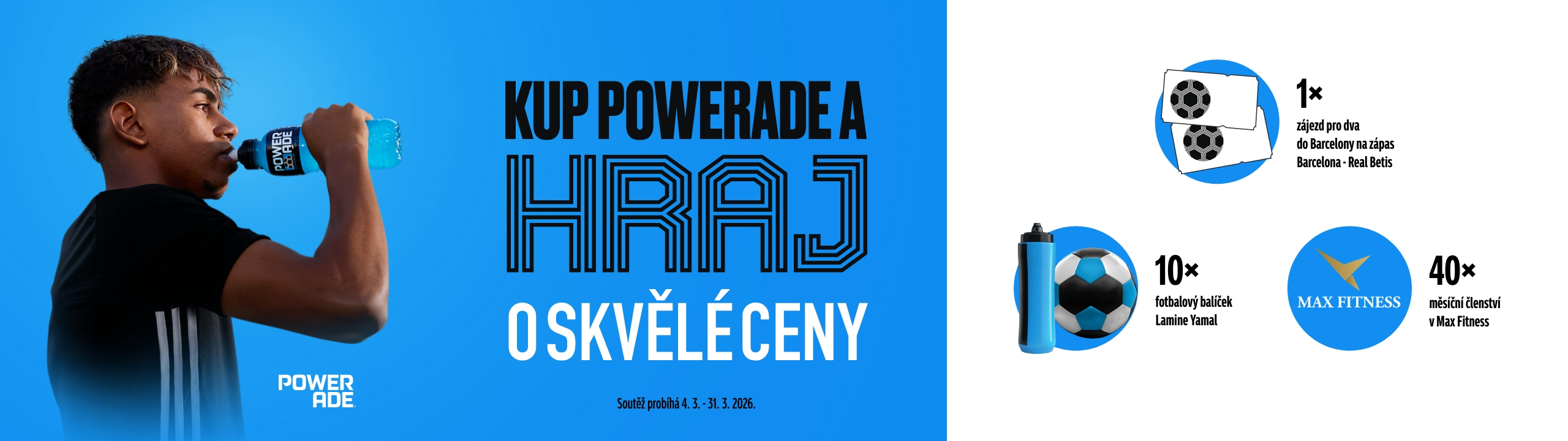 * Soutěžními produkty jsou: Powerade Mountain blast 0,5l PET, Powerade Mountain blast zero 0,5l PET, Powerade Golden Mango 0,5l PET, Powerade Zero Blackcurrant 0,5l PET.